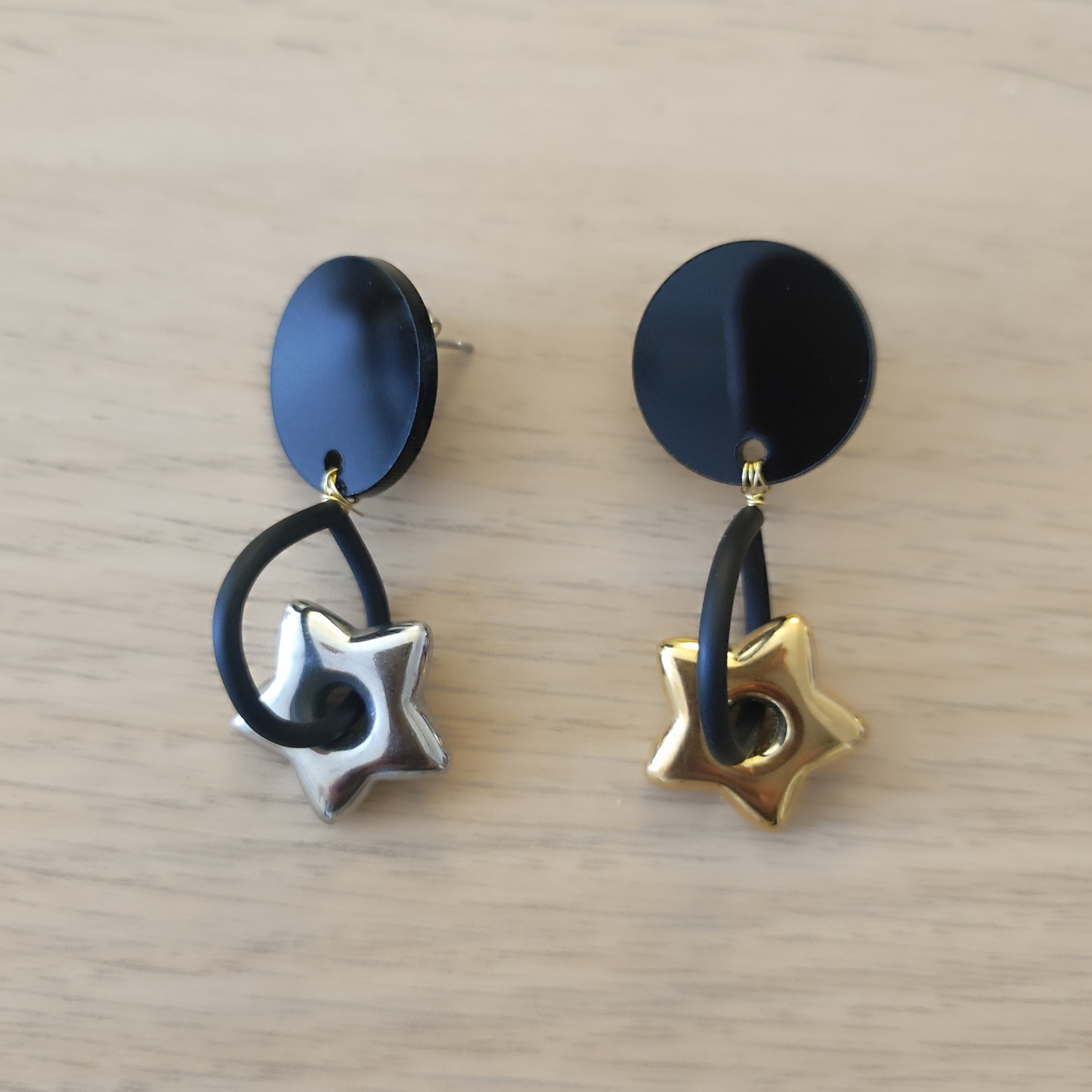 Σκουλαρίκια με plexiglass βάση, καουτσούκ και ατσάλινο αστέρι! Σε ασημί και χρυσό χρώμα κάνουν μαζί ένα ζευγάρι!