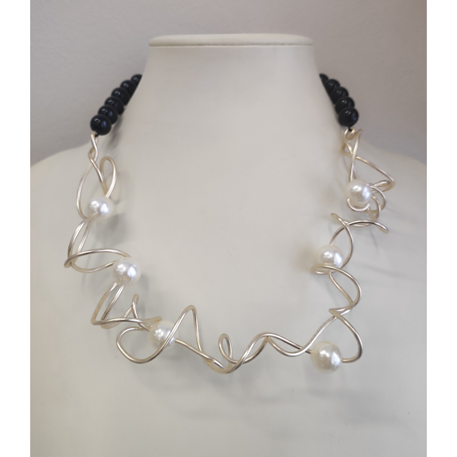 Κολιέ με μαύρες χάντρες, πέρλες και ένα αφηρημένο σπειροειδές σχέδιο στους 45-47 πόντους. Το κόσμημα συνδυάζει τα κλασσικά υλικά όπως οι πέρλες με ένα σύγχρονο καλλιτεχνικό σχεδιασμό κάνοντας το κατάλληλο για επίσημες περιστάσεις όσο και για μοντέρνες εμφανίσεις!